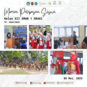 Pada hari Senin, 5 Mei 2025, SMA Negeri 1 Sragi menyelenggarakan acara pelepasan siswa kelas XII Angkatan ke-15 dengan suasana yang penuh khidmat dan kesederhanaan. Acara ini berlangsung di dalam ruangan dan dihadiri oleh seluruh siswa kelas XII, Kepala Sekolah, Dewan Guru, staf Tata Usaha, Komite Sekolah, serta tamu kehormatan, Pengawas Pembina SMA Negeri 1 Sragi, Ibu Dra. Nur Prima Qurbani, M.Si.